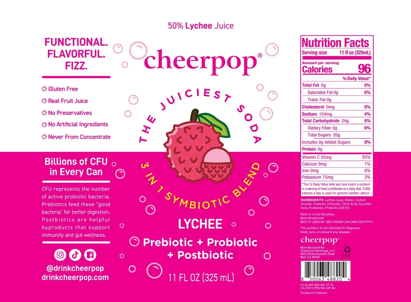 Delicate, crisp, and juicy—cheerpop lychee brings a refreshing swirl of rose and grape-like notes in every sip. Made with real lychee juice and our 3-in-1 symbiotic blend*, it’s a sparkling refreshment that supports your gut and satisfies your floral-sweet cravings.*