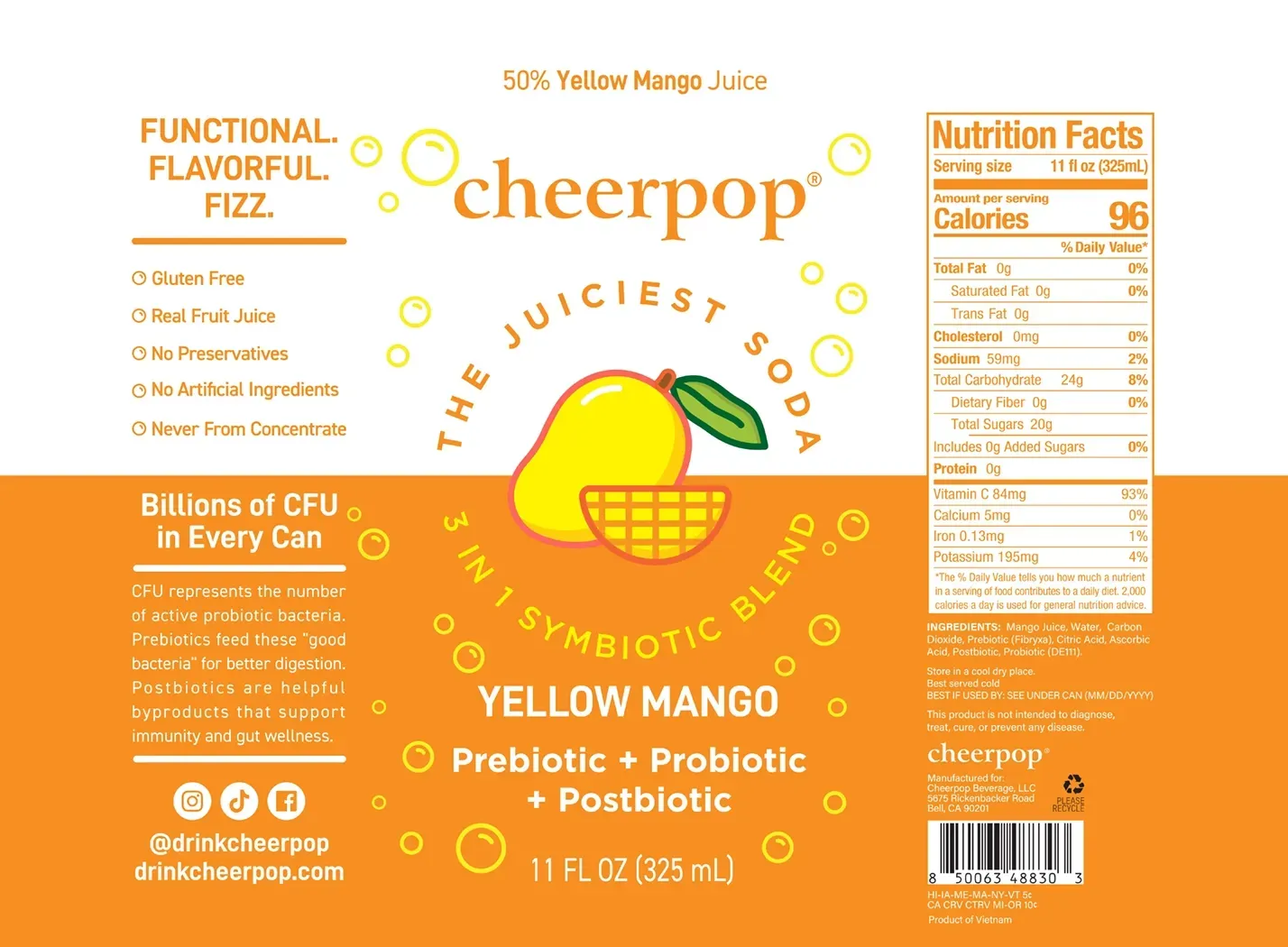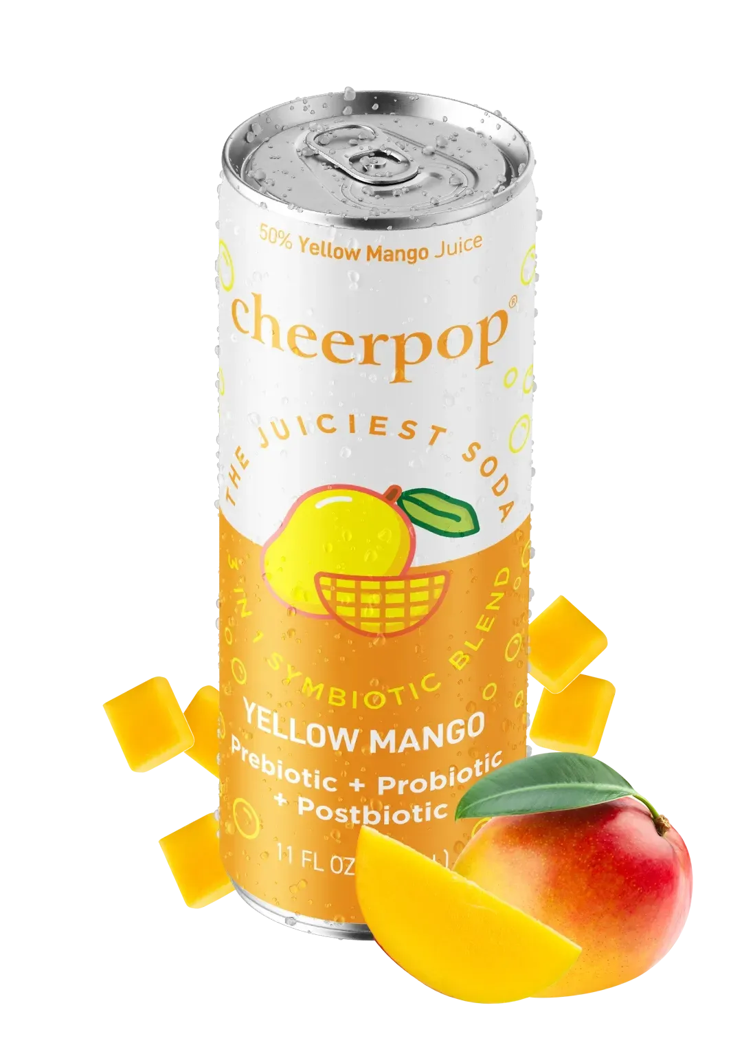 Smooth, mellow, and velvety—cheerpop Yellow Mango is tropical calm in a can. With lush mango flavor and a creamy finish, every sip delivers gentle sweetness alongside our 3-in-1 symbiotic blend*, designed to support your gut while you unwind and refresh.*